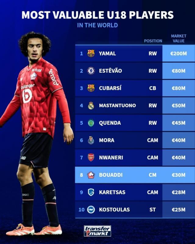 德国转会市场列出了U18球员身价排名,亚马尔2亿欧居首,埃斯特旺、库巴西次席。U18球员德转身价排名: